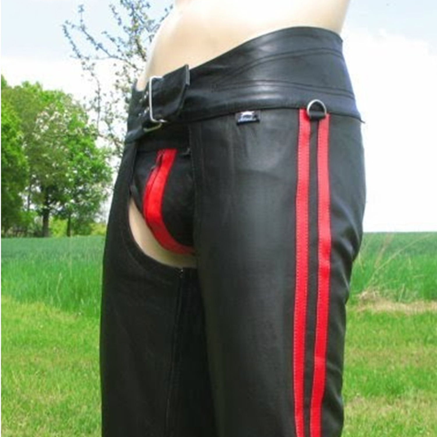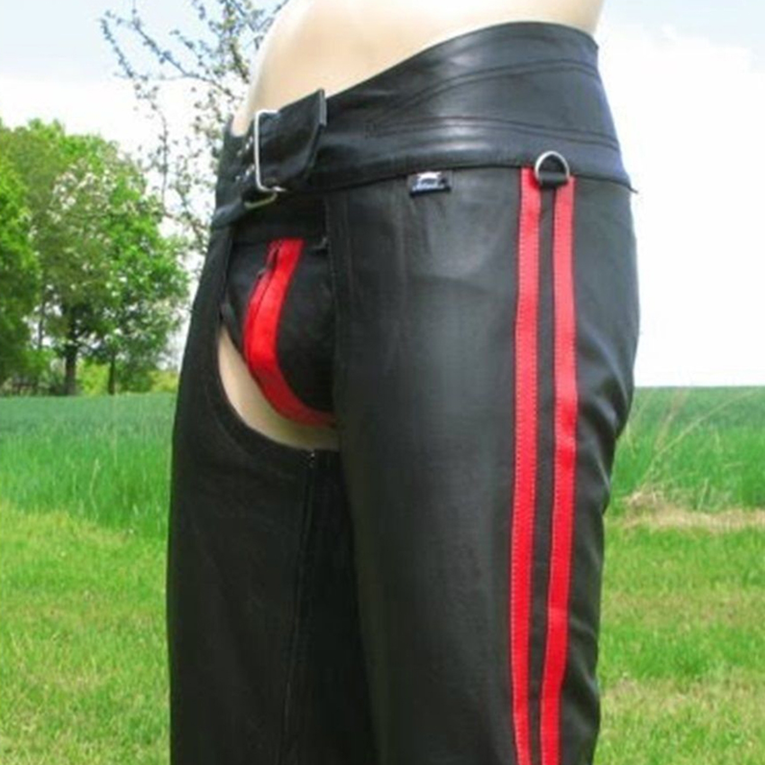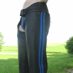 Very smooth , soft high quality Cowhide leather Chaps Colour Black with 2 Stripes for Biker, Cowboys, Rocker OR Stripper, inside Leg are heavy duty YKK Zipper These Chaps are made of one piece of soft Black cowhide leather, there is no patch work OR knee Join Belt Closure at the waist band, adjustable lace back These chaps will afford you the protection you need when riding the open road. They are made thick enough to offer you a much needed level of protection, but soft enough to keep you comfortable. 30,32,34,36,38,40 inches Waist